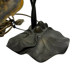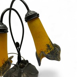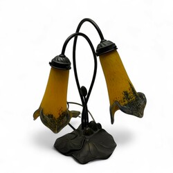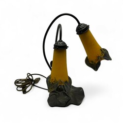 | Omschrijving | Tafellampje met twee geel met blauwe pâte-de-verre kelken, de voet in de vorm van leliebladeren, gemerkt en uitvoering ‘Art de France’ |