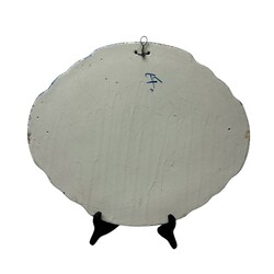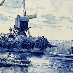 | Omschrijving | Een antieke laat 19e eeuwse aardewerken plaquette, met blauw-wit decor van vissers in een bootje en een spinnekopmolen op de achtergrond. Met gecontourneerde, gemarmerde rand. Verso gemerkt Tichelaar, Makkum. |