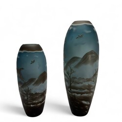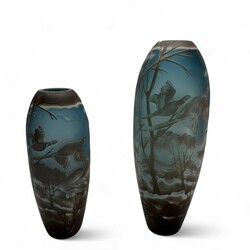 | Omschrijving | Twee cameoglazen vazen met bruin-wit decor van natuurlandschap met vliegende fazanten op blauwe onderlaag, naar Emile Gallé (1846-1904), beide gemerkt ‘Gallé Type’ |