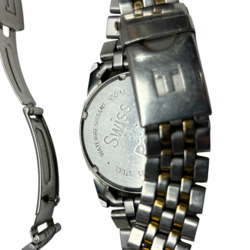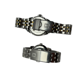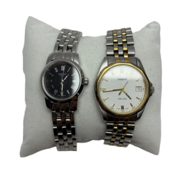 | Omschrijving | Twee stalen Tissot horloges, herenhorloge: model PR 100, en dameshorloge met zwarte wijzerplaat met Romeinse cijfers |