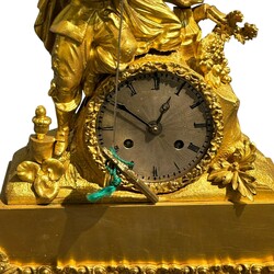 | Omschrijving | Vergulde beeldpendule: jonge heer met hoed en enkele florale motieven, 19e eeuw -verguldsel van latere datum- |