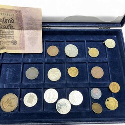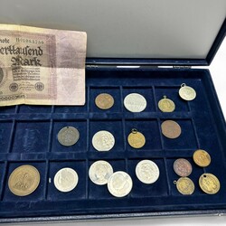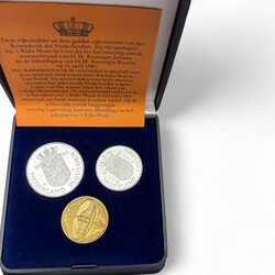 | Omschrijving | Verzameling medailles, munten en penningen, waaronder: penning 'Aankomst van Prins Willem VI in Scheveningen 1813', herdenkingspenning 'Nederland 40 jaar bevrijd', in origineel hoesje, en drie munten geslagen ter herinnering aan de troonafstand van Koningin Juliana / inhuldiging Koningin Beatrix op 30 april 1980, in originele cassette |
