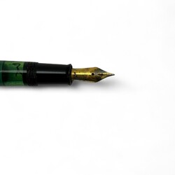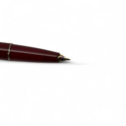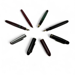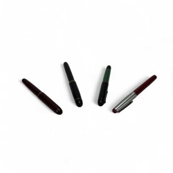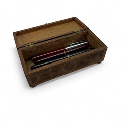 | Omschrijving | Vier vulpennen, waaronder twee met 14 karaats gouden punt, in kerfsnede houten doosje |