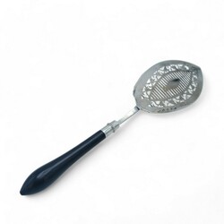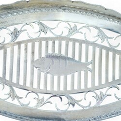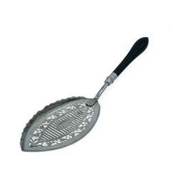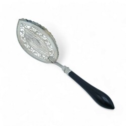| Omschrijving | Een antieke vroeg 19e eeuwse eerste gehalte zilveren visschep. Schuitvormig, met opstaande, gecontourneerde rand, gegraveerd met een vis, aan ebbenhouten greep, mr. Jan Buysen, Amsterdam 1808. |