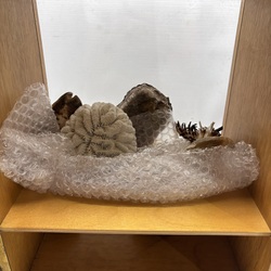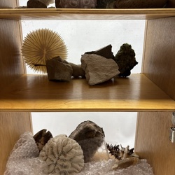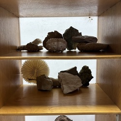 | Omschrijving | Houten vitrinekastje gevuld met verzameling mineralen en edelstenen: onder meer woestijnroos, zee-egel skelet, rozenkwarts, en koraal |