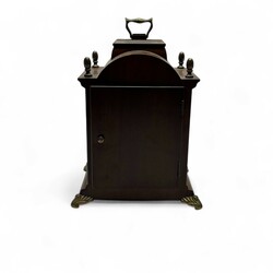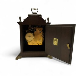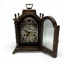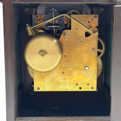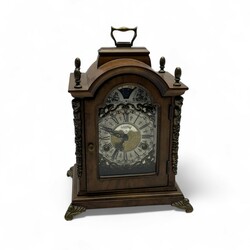 | Omschrijving | Een 20e eeuws wortelnoten gefineerd tafelklokje met maanstand en bronzen montuur, gemerkt Warmink op de wijzerplaat, uurwerk gemerkt Wuba. |