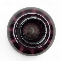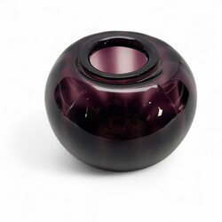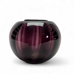 | Omschrijving | Een optisch paars glazen vaas, 13 cm hoog. Model Tomaat, een na grootste model. Ontwerp van W. J. Rozendaal (1899-1971). voor de Kristalunie, Maastricht uit 1929. |