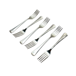 | Omschrijving | Lot van zes 20e eeuwse puur zilveren (999/1000) vorkjes, mr. Gerritsen, Zeist. Jaarletter D (1988). |