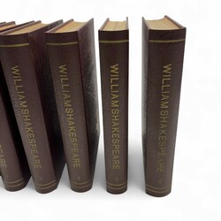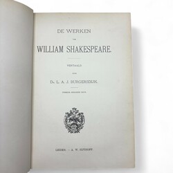| Omschrijving | Zesdelige boekenserie 'De werken van William Shakespeare, vertaald door Dr. L.A.J. Burgersdijk'. Tweede herziene druk, Leiden A.W. Sijthoff. Laat 19e eeuw. |