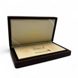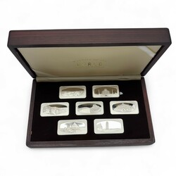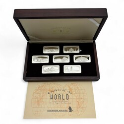 | Omschrijving | Een 20e eeuwse houten cassette gevuld met zeven derde gehalte (800/1000) zilveren baartjes, Wonders of the World, Singapore Airlines |