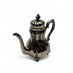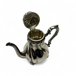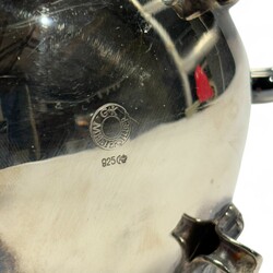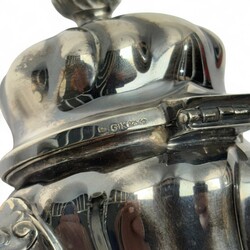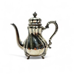 | Omschrijving | Een 20e eeuws eerste gehalte (925/1000) zilveren mokkakan, geplaatst op vier krulpootjes. Aan de onderzijde gemerkt ‘G+K Meistersilber’ en ‘925’, naast een maan en kroon. |