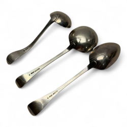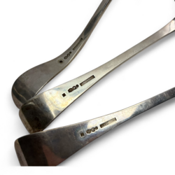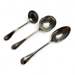 | Omschrijving | Lot van drie stuks 20e eeuws tweede gehalte (835/1000) Fries zilveren opdienbestek, model Haags Lof. Bestaande uit juslepel, aardappellepel en groentelepel. Allen gemerkt mr. Schijfsma/Sustring Sneek (1948-1950) & ‘Frysk Hanwurk’, jaarletter N (1948). |