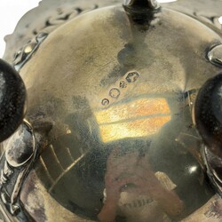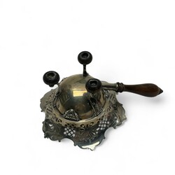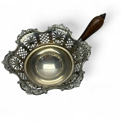 | Omschrijving | Een 20e eeuws tweede gehalte (835/1000) zilveren pijpkomfoor in Louis XIV stijl. Ajour gezaagde rand met ornamentiek, geplaatst op drie gebogen pootjes met ronde houten knoppen en een gedraaide houten greep. Aan de onderzijde gekeurd met lopende leeuw, minervakopje, mr. Zaanlandse Zilversmederij en jaarletter C (1962) |