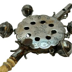 | Omschrijving | Zilveren rammelaar versierd met belletjes en fluit en voorzien van benen greep |