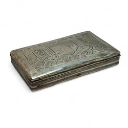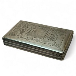 | Kavel | 1718. zilveren tabaksdoos met graveerwerk van molen en boot |