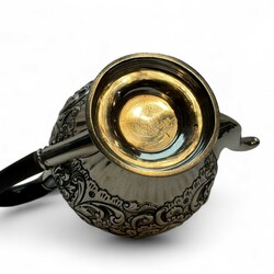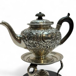| Omschrijving | Zilveren theepot rijk versierd met floraal drijfwerk,compleet met een zilveren comfoor |
