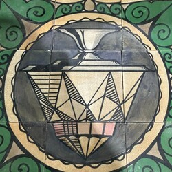 | Omschrijving | Een negendelig aardewerken polychroom tegeltableau met een afbeelding van een Amsterdamse school tafellamp, ca 1930. Hierbij zeven antieke losse tegels met medallion. |