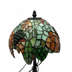 | Omschrijving | Een Tiffany stijl tafellamp op een gebruineerd metalen stam en bladvormige lampenvoet. Met een oranje / groen met druiventrossen glas in lood kap. |