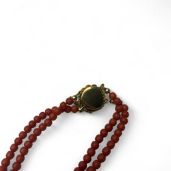 | Omschrijving | Een twee rijgig bloedkoralen armband aan een 14 krt (585/1000) gouden slot met een cabuchon geslepen bloedkoraal. |