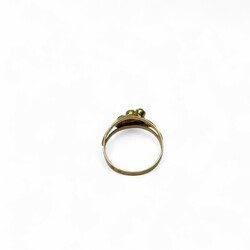 | Omschrijving | Een 20e eeuwse 14 karaats (585/1000) geelgouden damesring, gedeeltelijk gegraveerd en bezet met drie gefacetteerde granaatjes. Gemerkt met eikenblaadje en meesterteken 'JV2'. |