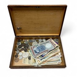 | Omschrijving | Houten gestoken kist met papier en muntgeld, diverse landen. Waaronder Hongkong, Malta, Iran, Italië, Zimbabwe en een Nederlands 10 gulden biljet uit 1953. |