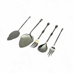 | Omschrijving | Lot met vijf stuks tweede gehalte(835/1000) zilveren opdienbestek. Bestaande uit couvert, cakeprikker en twee pasteischeppen. |