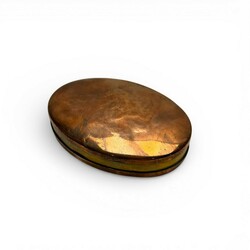 | Omschrijving | Lot diversen: een antieke 18e of 19e eeuwse rood- en geelkoperen tabaksdoos, ovaal model, een antiek 19e eeuws kristallen parfumflacon met tweede gehalte (835/1000) zilveren hals en dop, en een 20e eeuws tweede gehalte (835/1000) zilveren suikerschepje met getorste steel, bekroond met eikeltje, gemerkt JSIII (Schijfsma/Sustring Sneek). |
