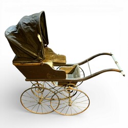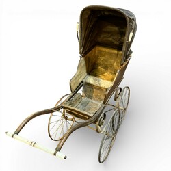 | Omschrijving | Een antieke kinderwagen op een metalen met houten frame, metalen wielen, lederen kap en porseleinen grepen. ca 1900. |