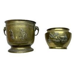 | Omschrijving | Lot, waaronder: drie koperen/metalen Turks/Arabische Dallah koffiepotten, Chinese messing bloempot met grepen in de vorm van olifantenhoofden, etc. |