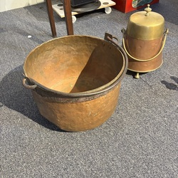 | Omschrijving | Lot diversen bestaande uit een grote koperen emmer, houtenkolenbak, koperen doofpot en twee messing drielichts kandelaars. |