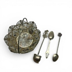 | Omschrijving | Een lot met Indonesische 3e gehalte 800/1000) of BWG zilverwerk, bestaande uit lepeltjes met mineralen, een fillegrain mandje met hengsel. Totaal 142 gram. |