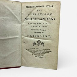 | Omschrijving | Lot van vier boeken: twee boeken ‘Tegenwoordige Staat der Vereenigde Nederlanden’ veertiende en vijftiende deel, ‘bevattende het Vervolg der Beschryving van Friesland’, te Amsterdam, Leiden, Dord. en Harlingen, 1785 en 1786, beide met gravures en kaarten. En twee boeken ‘Hedendaagsche Historie of Tegenwoordige Staat van Alle Volkeren, vijftiende en zestiende deel, Friesland eerste Deel en Vierde deel, 1785 en 1789, onder andere met kaart van Friesland. |