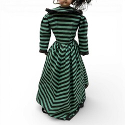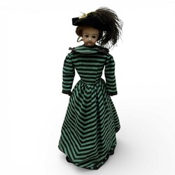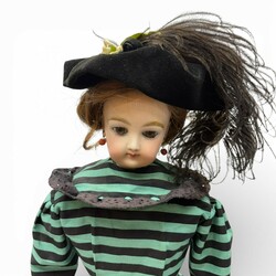 | Omschrijving | Een pop met een porselenen hoofd en met lederen handen en voeten. Gekleed in een jaren 20 stijl jurk en hoed. Met bloedkoralen oorhangers. Naar een antiek voorbeeld. Niet gemerkt. Waarschiijnlijk een nieuwer hoofd op antiek lijfje. Op standaard. |