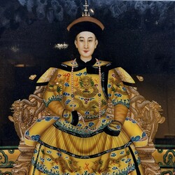 | Omschrijving | Lot van twee 20e eeuwse Chinese achterglasschilderingen, portret van keizer en keizerin. In gelakte houten lijstjes. |