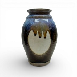 | Omschrijving | Twee aardewerken designvazen met een bruin/blauwe en een rood/ wit glazuur. Grootste vaas is een ontwerp en gemerkt voor Han Boerrigter (1935-2023). |