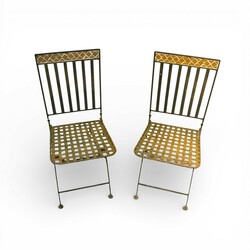| Omschrijving | Paar metalen stoelen met open rug en ingelegd geometrisch patroon bovenin de rugleuning. Zitting met gevlochten bandwerk. |