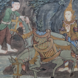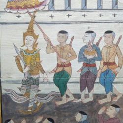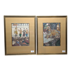 | Omschrijving | Lot van twee Tibetaanse schilderijen met voorstelling van paarden bij een drinkplaats en parade met godin. Met teksten op de achterzijde. |