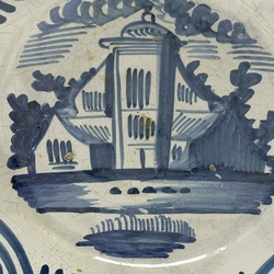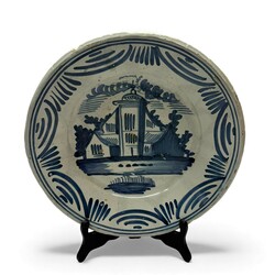 | Omschrijving | Een grote laat 18e eeuwse Fries aardewerken schotel met blauw-wit landschapsdecor. vermoedelijk Tichelaar, Makkum. |