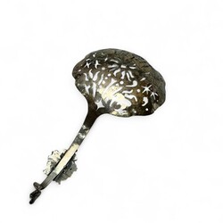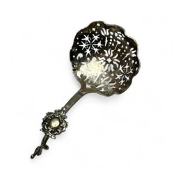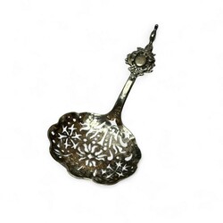 | Omschrijving | Een antieke 18e eeuwse zilveren suikerstrooilepel, met ajour gezaagde bak, steel met schildvormig ornament en bekroond met een vogeltje. Gekeurd met onduidelijk meesterteken (‘VW’?) |