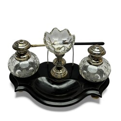 | Omschrijving | Een antiek 19e eeuws inktstel, ca. 1860, op zwarthouten basement, met twee kristallen potjes, met tweede gehalte (835/10000 zilveren montuur en deksel. |