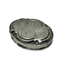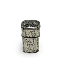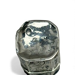 | Omschrijving | Lot van twee tweede gehalte (835/1000) Nederlands zilveren doosjes. Eén 19e eeuws lodereindoosje, achtkantig model, gegraveerd en filigrain bewerkt. Jaarletter A (1860) en meesterteken (waarschijnlijk) JS160 = Jan Schuifsma, werkzaam te Woudsend en Sneek tussen 1840 en 1898. Tevens met stippelgravure ‘G.H.B.’ en onduidelijk jaartal. Met daarbij een ovaal 19e eeuws pepermunt- of pillendoosje, onduidelijk meesterteken, jaarletter F (1865). |