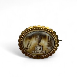 | Omschrijving | Een antieke 19e eeuwse 14 karaats (585/1000) ovale geelgouden broche met geschulpte rand. In het midden een ovaal haarwerkje met urn in landschap en initialen ‘I.S.’ en datering 20 april 1869. Verso gekeurd met oud eikenblaadje. |