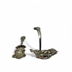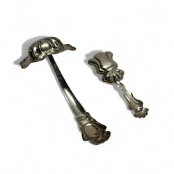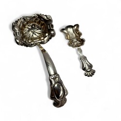 | Omschrijving | Een antieke 19e eeuwse tweede gehalte (835/1000) zilveren suikerstrooilepel, mr. IK17 = Johannes Lambertus Kroijmans, werkzaam te Oss en Schijndel, periode 1838 tot 1881. Met daarbij een 19e eeuws tweede gehalte (835/1000) zilveren suikerschepje of theeduimpje, gemerkt 77B = Brunings, Joure, 19e eeuw. |