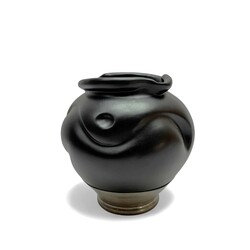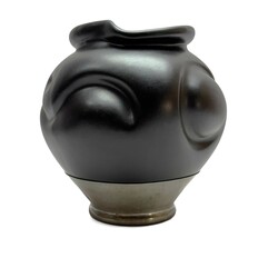 | Omschrijving | Een jaren '30 zwart aardewerken vaas, art deco met tinnen montuur, uitvoering plateelbakkerij Zuid-Holland & Gero Tin, ca. 1930. Aan de onderzijde gemerkt 'Gero Holland' en serienummer 6120. |