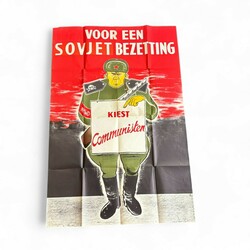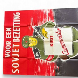 | Omschrijving | Een 20e eeuws affiche met tekst ‘Voor een Sovjet bezetting Kiest communisme’. Uitgegeven in 1956, aan de onderzijde opschrift ‘Vrede en vrijheid’. Originele tekst was ’Russische bezetting’, overheen geplakt. Ontwerp ‘SK’ |