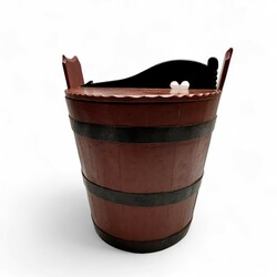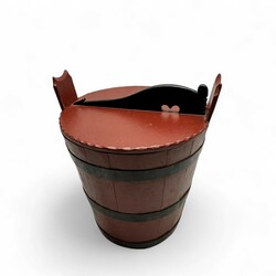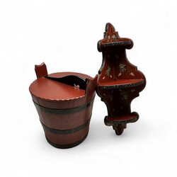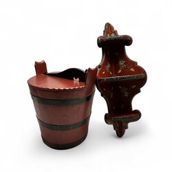| Omschrijving | Een beschilderde houten ronde ton met deksel zgn butte. Hierbij een Hindelooper beschilderde hoekconsole. Beide 20e eeuws. |