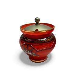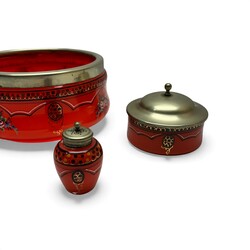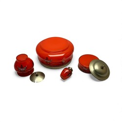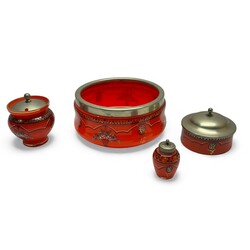 | Omschrijving | Lot van vier stuks vroeg 20e eeuws boheems glas, oranje, met emaille beschildering. Allen met metalen deksel of montuur. O.a. een grote kom en een strooibus. |