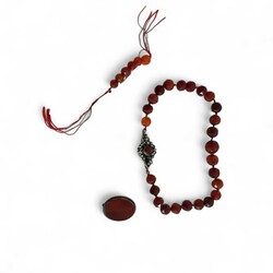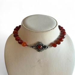 | Kavel | 2387. Carneolen halssnoer met zilveren slot en agaten broche |