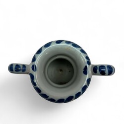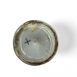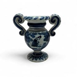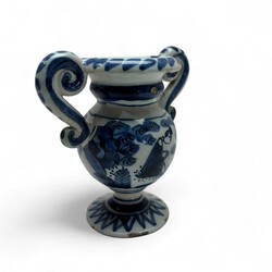 | Omschrijving | Een antiek 17e eeuws Delfts aardewerken tweeorenvaasje, met blauw-wit Chinoiserie decor. Aan de onderzijde gemerkt 'X'. |