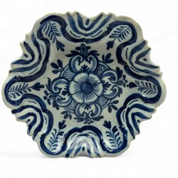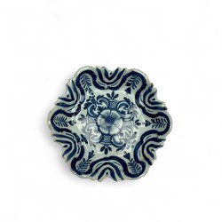| Omschrijving | Een antiek 18e eeuws Delfts aardewerken pattipannetje met gecontourneerde rand, blauw-wit beschilderd met floraal decor, op drie pootjes. |